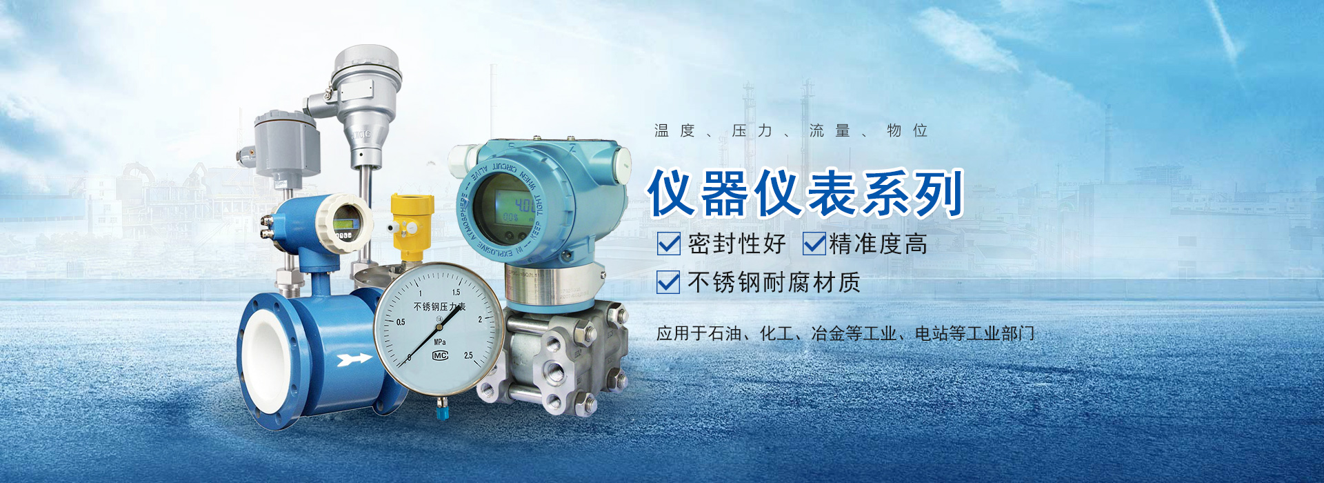 公司生產的各類儀器儀表品種、規格齊全,具有結構新穎、性能良好、操作簡便、使用方便等特點,較好地滿足了客戶對儀表的需求,廣泛用于石化、冶金、機械、制藥、釀造、電力等以及其他工業領域。